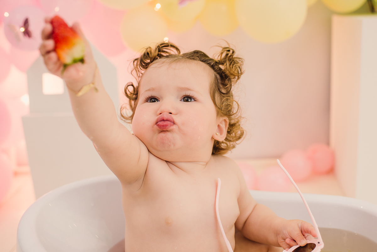 Moana nos levou para um jardim de cores, onde as borboletas dançavam ao redor da sua alegria contagiante. 📸✨ E, para a surpresa final, uma banheira repleta de morangos, criando um cenário de puro encanto e sabor. 🍓🛁